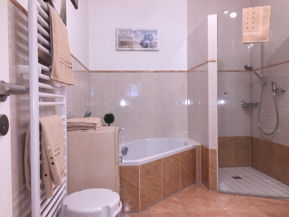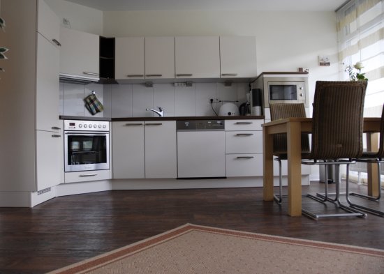 Die geräumige Wohnung (82qm) im 1. OG (Fahrstuhl vorhanden) verfügt über ein großes Schlafzimmer mit Doppelbett (2 x 2m), ein geräumiges Wohnzimmer mit einer Wohnlandschaft und Fernsehsessel, eine an das Wohnzimmer angrenzende Küche mit kompletter Ausstattung (Geschirrspüler, Backofen, Mikrowelle, Kühlschrank mit Gefrierfach) und Essecke, sowie ein Bad mit Dusche und Wanne. WLAN-Netz kann kostenlos genutzt werden. Auf dem Balkon können Sie in den bequemen Liegestühlen ausspannen oder aber gemütlich am Tisch beisammen sitzen. PKW Stellplatz, Unterstellmöglichkeit für Fahrräder, sowie ein kleiner Abstellraum sind ebenfalls vorhanden. 2 Fahrräder sind vorhanden und können kostenlos genutzt werden. Waschmaschine und Trockner stehen im Keller zur Gemeinschaftsnutzung ebenfalls zur Verfügung. Ein LCD Fernseher ist sowohl im Wohnzimmer als auch im Schlafzimmer vorhanden.